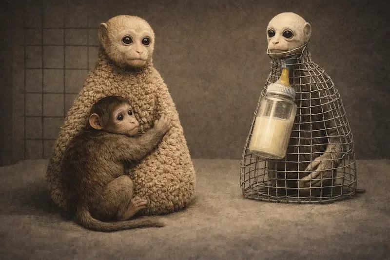Los experimentos de Harry Harlow con monos rhesus marcaron un antes y un después en la concepción de si el apego es una necesidad primaria o secundaria. Según la idea dominante, si a un cachorro le ofrecían dos muñecos que hicieran de madres sustitutas, elegiría aquella que le proporcionara el alimento. Se ideó un dispositivo en el que había dos madres, una de felpa que no proporcionaba alimento y otra de alambre que sí proporcionaba alimento. En el vídeo original de finales de la década de 1950 se puede ver cómo los monos preferían pasar más tiempo con la madre de felpa (que proporciona calor al contacto) que con la madre de alambre (aunque este último era el que le proporcionaba el alimento).